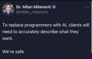 AI kan een ontwikkelaar (of architect, of … of …) niet vervangen zolang de vraag-kant zo wollig en onduidelijk blijft in het pakket van eisen.